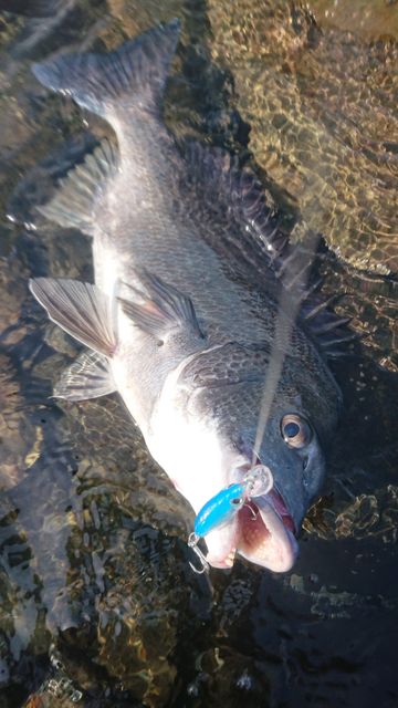 が、真昼間にトップに出てくれる勇敢なお魚さんが居なかったので、愛用のジャークベイトをしゃくったら黒い影が2匹チェイスしながら沖の方から追って来たのが見えた。しめしめと思ってジャークにクワセの間を入れたら、今だとばかりの反転食いw狙い通りのストライクを頂き感無量。3回ほど真鯛と同等かと思うほどのパワーで突っ込んだけど無事にランディング。