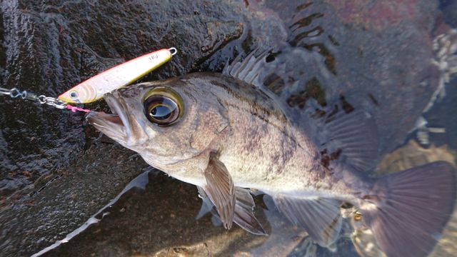 ボトムまで落としてから5回シャクリでボトムまで落とすの動作でシーバス釣れないかと期待したら、潟でまさかのメバルちゃんが降臨。